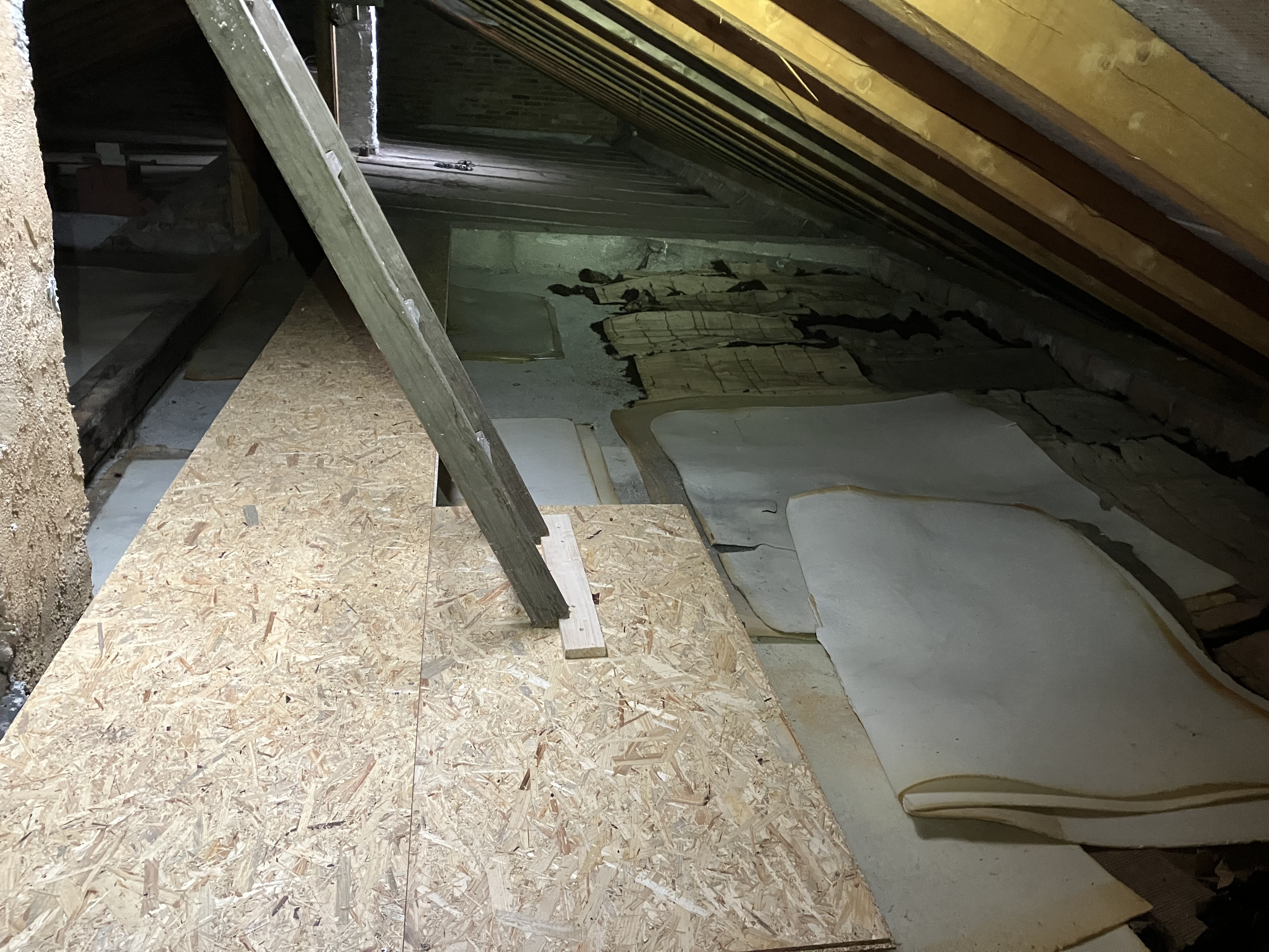 Na začátku realizace jsme vybudovali revizní lávku, aby se zákazník mohl pohodlně dostat ke komínu a vikýři. Poté jsme aplikovali foukanou izolaci Knauf Supafil Loft ve výšce 30 cm, která byla zcela pokryta v rámci dotace NZÚ Light. Tím vznikla dokonalá izolační vrstva bez tepelných mostů.
